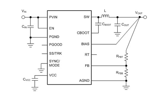 Figure 1: Texas Instruments’ LM73605/LM73606 family of synchronous step-down DC/DC converters deliver up to 5A (LM73605) or 6A (LM73606) from a supply voltage ranging from 3.5 to 36V, with a quiescent current of 0.8µA in shutdown mode. (Source: Texas Instruments)