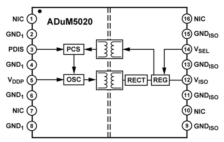 Figure 2: Analog Devices’ ADuM5020 DC/DC converter has a galvanic isolation up to 3,000V. (Source: Analog Devices)