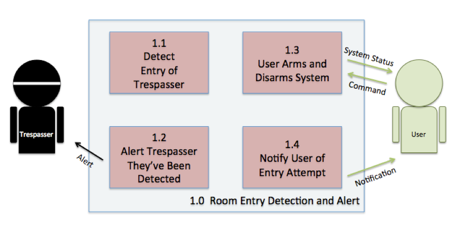 Obviously when developing homebrewed electronics following the entire systems engineering process is, well, a bit much. So what aspects are valuable? Let’s consider the following. Let’s imagine we’ve been hired to build a custom solution and the top-level requirement we have received from our customer is they want a way to be alerted when someone enters a room in their house. The requirement is vague, so how do we move forward? At this point, if you are like me, your mind immediately jumps to thinking of all the electronics components and software we’re going to need. But we need to resist that urge. Instead spend some upfront legwork fleshing out the requirements and identifying the functionality, not the components, needed for the project. So let’s brainstorm the functionality we want include. Then if you’re like me we will to graphically notate the requirements in top level Functional Block Diagram (see Figure 1):