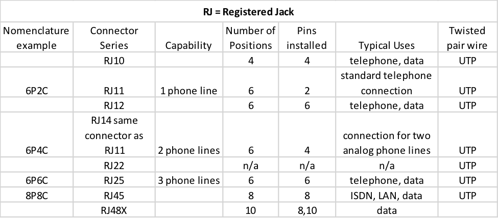 I’ll try to demystify the RJ connector starting with some basic information and examples of common industry abbreviations and acronyms. Note that some of these don’t only apply to the connector but also to the wire that is used with these connectors. The more you know about the connector-wire combination the better off you’ll be at understand what connector you’ll need for your application.