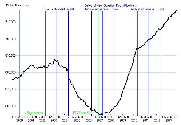 At the end of last year, the FCC database showed 717,201 licensed amateurs in the U.S. -- a record -- and an increase of 7,626 from the previous 12 month period. Club station licenses showed a record number of 11,363, having risen by 7% over the previous year (28,886 versus 27,082).